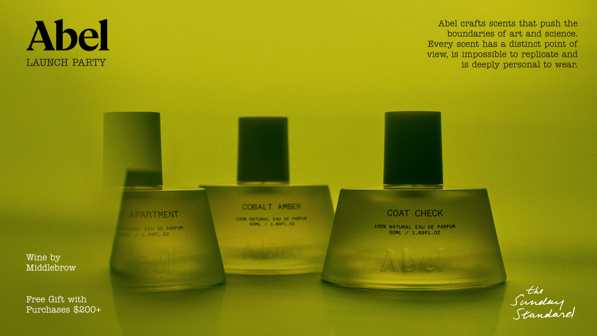 Complimentary wine by Middlebrow. All purchases of $200+ will receive a complimentary 6ML Abel Fragrance of their choosing. While supplies last.